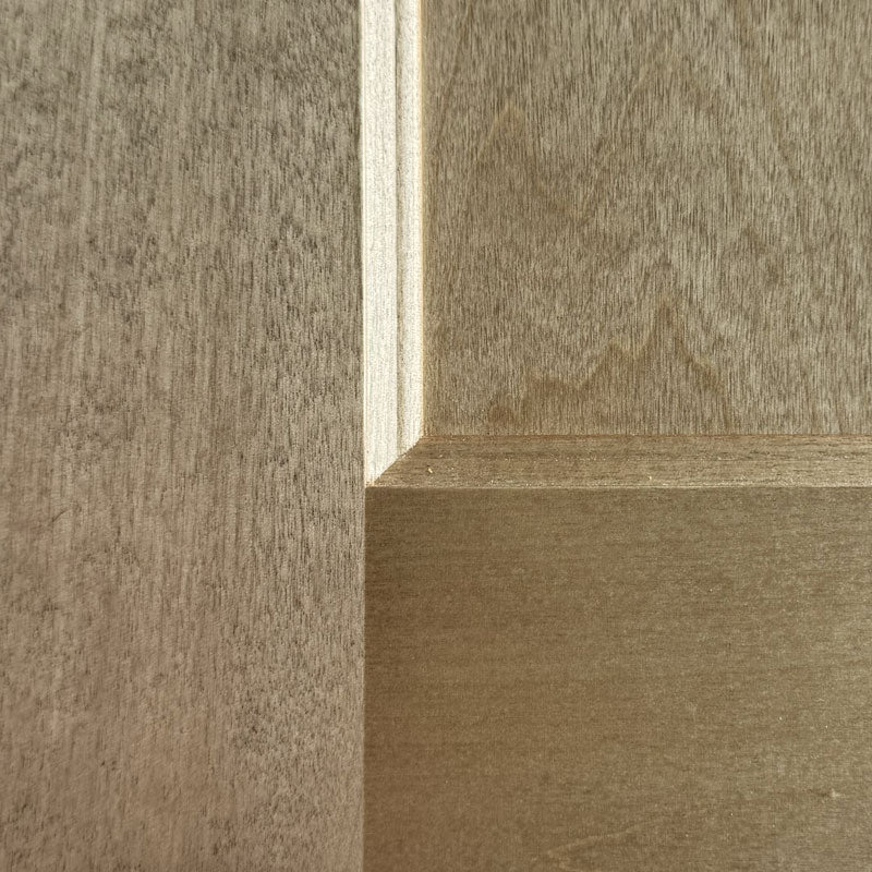 All of our cabinetry is solid wood with Birch doors and face frames. The sides and backs are 1/2" 7 Ply Plywood with 3/4" plywood shelves. The doors have soft close hinges and the drawer boxes are dovetailed with undermount, full extension soft close drawer glides.
